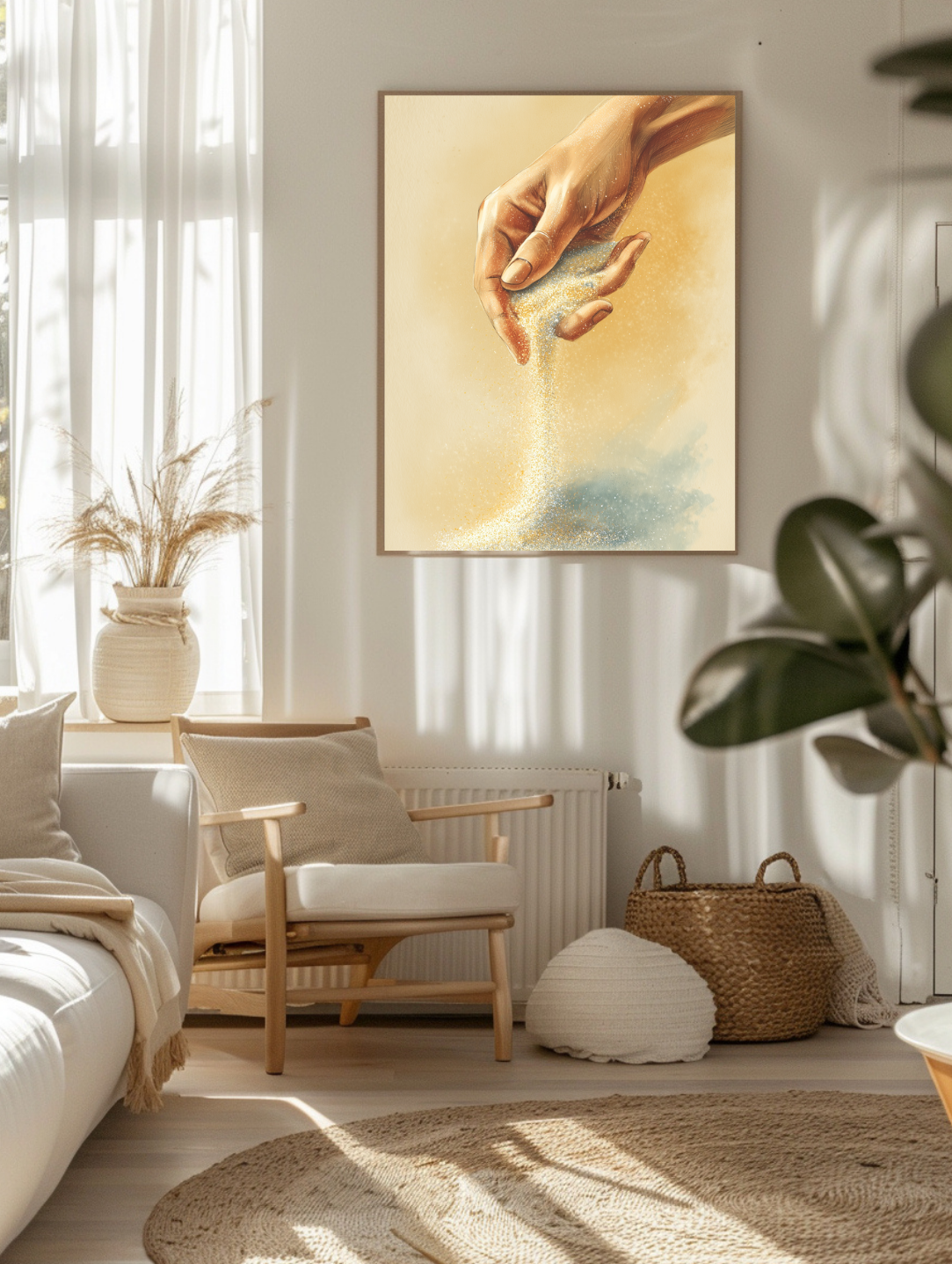 Hay momentos en los que sostener se vuelve demasiado pesado. “Soltar” no es perder, es elegir vivir más ligero. Esta lámina representa ese instante en el que algo cae de tus manos y, con ello, recupera la libertad. Su presencia en tu hogar te recordará que no todo lo que cargas es tuyo, y que soltar es también un acto de amor propio.